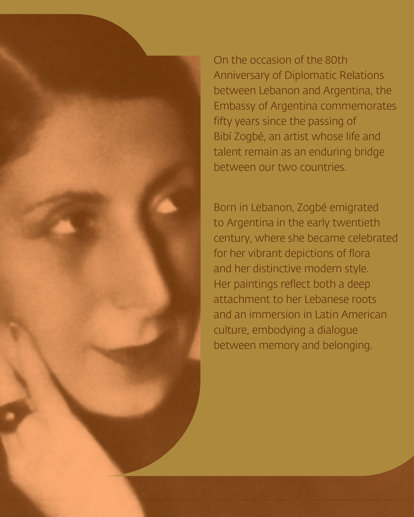 On the occasion of the 80th Anniversary of Diplomatic Relations between Lebanon of Argentina, the Embassy of Argentina commemorates fifty years since the passing of Bibí Zogbé, an artist whose life and talent remain as an enduring bridge between our two countries.